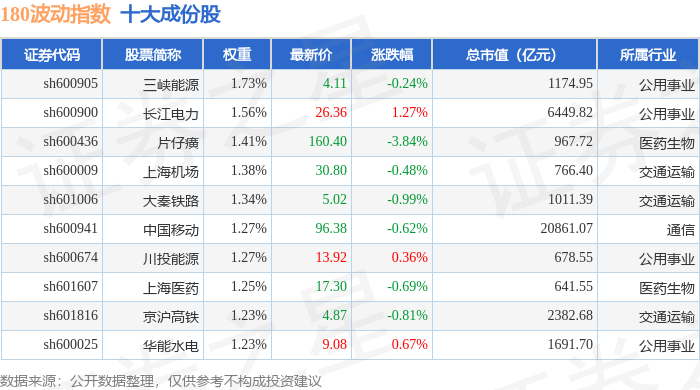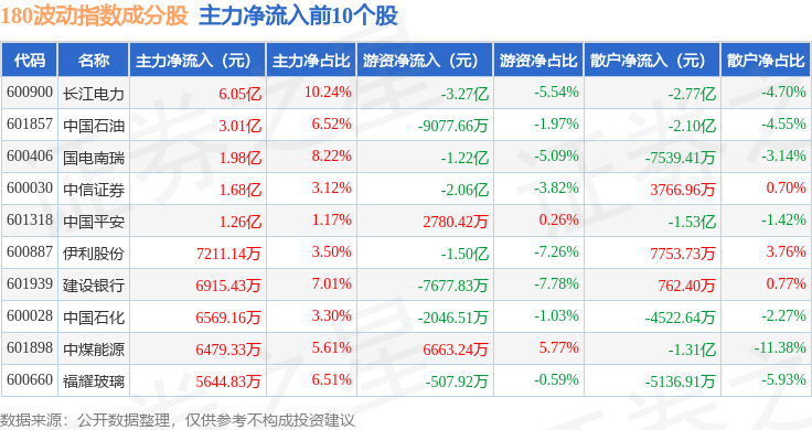 资金流向方面,180波动(000129)指数成份股当日主力资金净流出合计38.63亿元,游资资金净流入合计9.35亿元,散户资金净流入合计29.29亿元。成份股资金流向详情见下表: