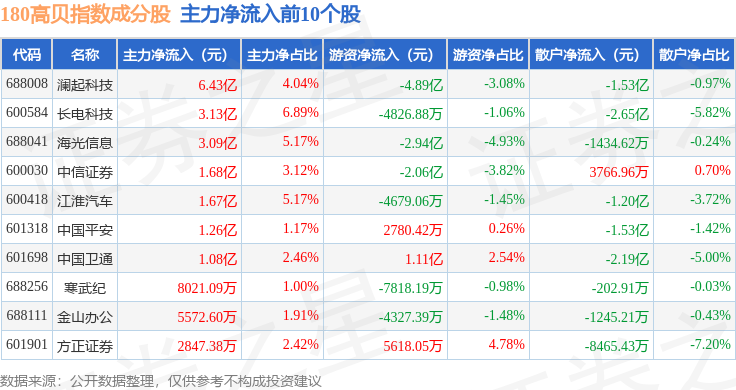 资金流向方面,180高贝(000135)指数成份股当日主力资金净流出合计72.45亿元,游资资金净流入合计23.16亿元,散户资金净流入合计49.3亿元。成份股资金流向详情见下表: