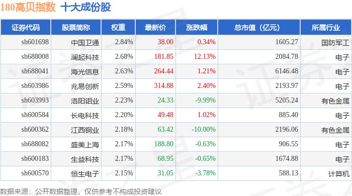 180高贝(000135)指数十大成份股详情如下: