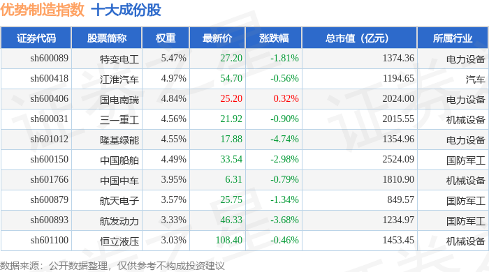 优势制造(000146)指数十大成份股详情如下: