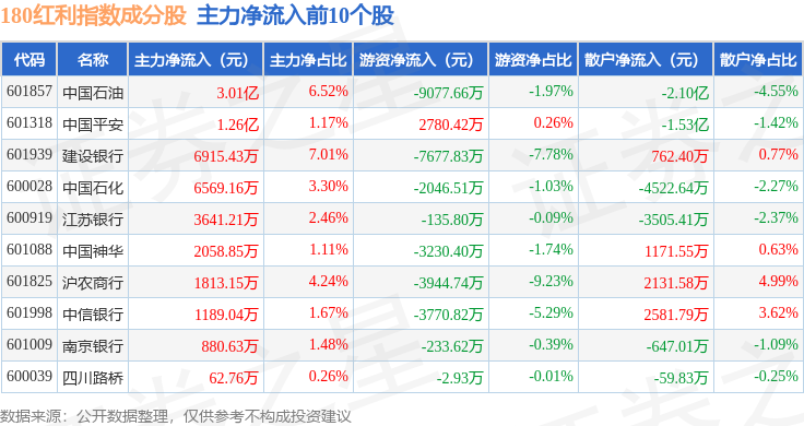 资金流向方面,180红利(000149)指数成份股当日主力资金净流出合计13.09亿元,游资资金净流入合计2.56亿元,散户资金净流入合计10.53亿元。成份股资金流向详情见下表: