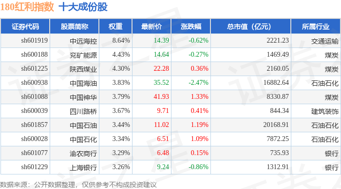 证券之星消息,1月30日,180红利(000149)指数报收于3933.66点,跌0.4%,成交583.04亿元,换手率0.35%。当日该指数成份股中,上涨的有9家,中国神华以1.33%的涨幅领涨,下跌的有19家,中国海油以2.47%的跌幅领跌。