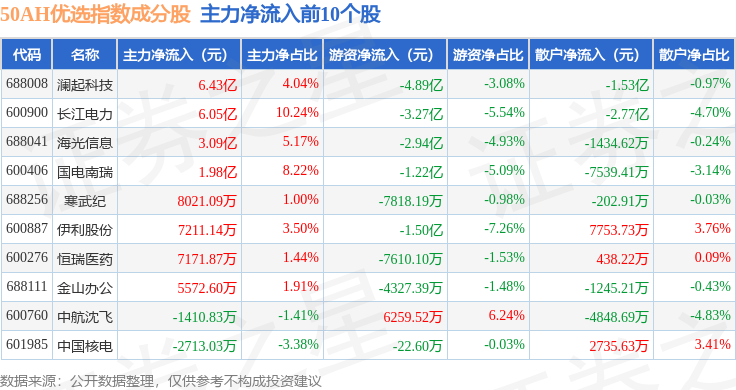 资金流向方面,50AH优选(000170)指数成份股当日主力资金净流出合计34.07亿元,游资资金净流入合计6.2亿元,散户资金净流入合计27.87亿元。成份股资金流向详情见下表: