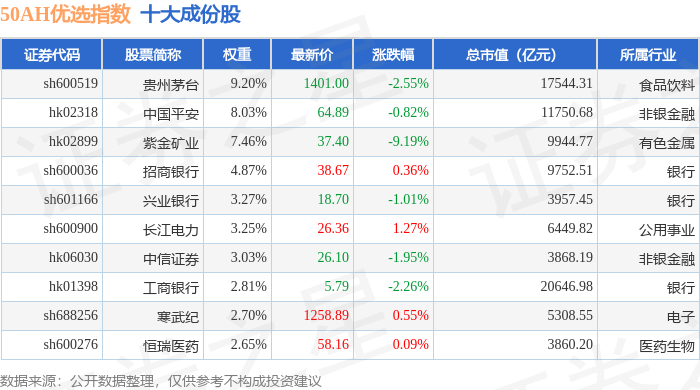 证券之星消息,1月30日,50AH优选(000170)指数报收于6439.34点,跌1.85%,成交1470.09亿元,换手率0.71%。当日该指数成份股中,上涨的有11家,澜起科技以12.13%的涨幅领涨,下跌的有37家,紫金矿业以9.19%的跌幅领跌。