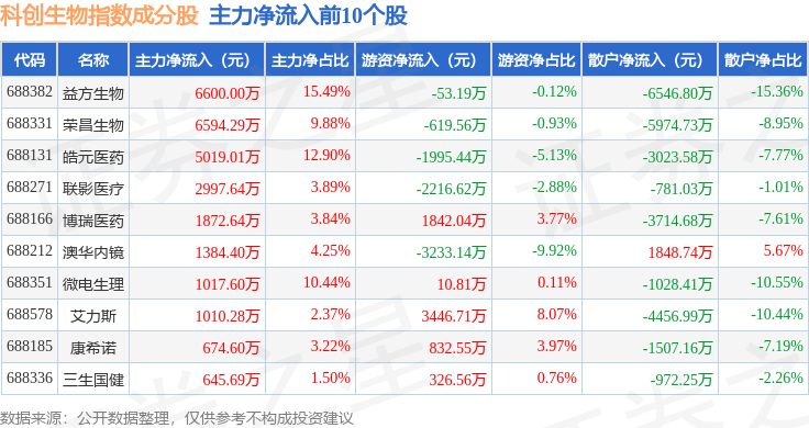 资金流向方面,科创生物(000683)指数成份股当日主力资金净流出合计2.2亿元,游资资金净流入合计1.23亿元,散户资金净流入合计9669.78万元。成份股资金流向详情见下表: