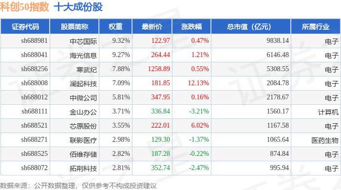 证券之星消息,1月30日,科创50(000688)指数报收于1509.4点,涨0.12%,成交929.95亿元,换手率2.21%。当日该指数成份股中,上涨的有9家,澜起科技以12.13%的涨幅领涨,下跌的有40家,阿特斯以6.08%的跌幅领跌。