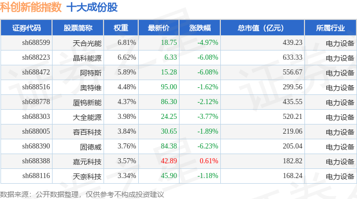 科创新能(000692)指数十大成份股详情如下: