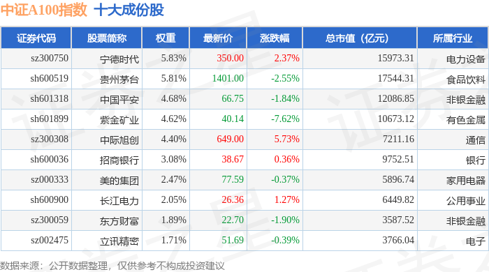 中证A100(000903)指数十大成份股详情如下: