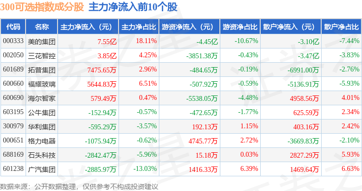 资金流向方面,300可选(000911)指数成份股当日主力资金净流出合计10.02亿元,游资资金净流入合计3.62亿元,散户资金净流入合计6.4亿元。成份股资金流向详情见下表: