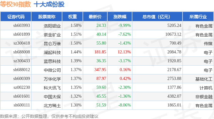 证券之星消息,1月30日,等权90(000971)指数报收于3406.82点,跌0.78%,成交4417.26亿元,换手率0.66%。当日该指数成份股中,上涨的有30家,澜起科技以12.13%的涨幅领涨,下跌的有57家,洛阳钼业以9.99%的跌幅领跌。