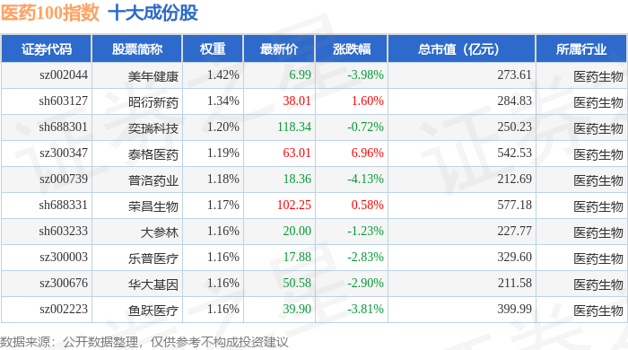 医药100(000978)指数十大成份股详情如下: