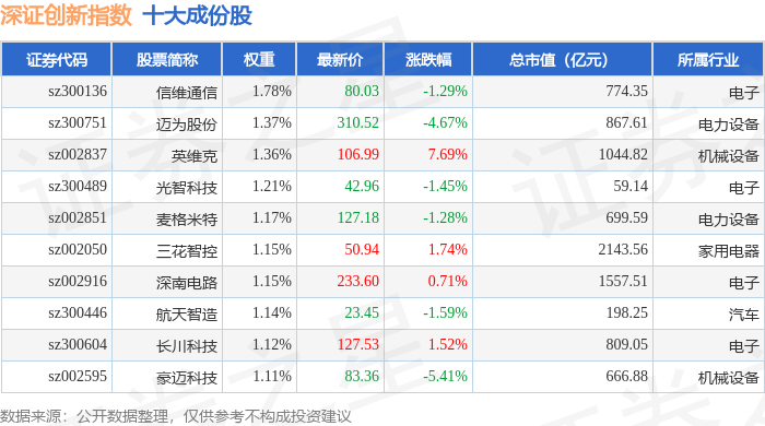 深证创新(399016)指数十大成份股详情如下: