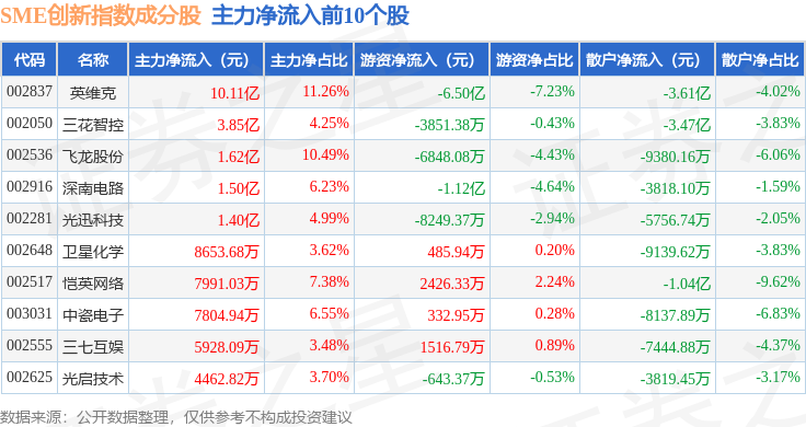 资金流向方面,SME创新(399017)指数成份股当日主力资金净流出合计36.27亿元,游资资金净流出合计1.37亿元,散户资金净流入合计37.64亿元。成份股资金流向详情见下表:
