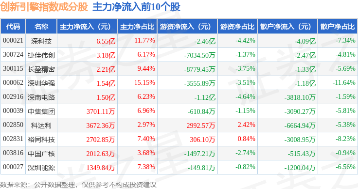 资金流向方面,创新引擎(399050)指数成份股当日主力资金净流出合计35.87亿元,游资资金净流入合计4.89亿元,散户资金净流入合计30.98亿元。成份股资金流向详情见下表: