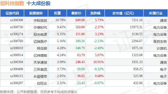 创科技(399276)指数十大成份股详情如下:
