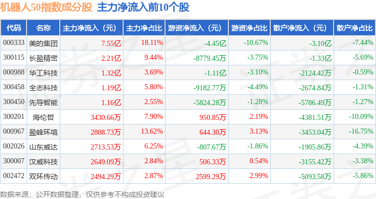 资金流向方面,机器人50(399283)指数成份股当日主力资金净流出合计3.5亿元,游资资金净流出合计5.17亿元,散户资金净流入合计8.68亿元。成份股资金流向详情见下表: