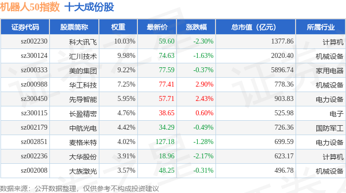 机器人50(399283)指数十大成份股详情如下: