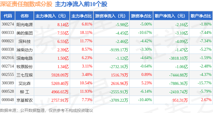 资金流向方面,深证责任(399341)指数成份股当日主力资金净流出合计54.25亿元,游资资金净流入合计6.29亿元,散户资金净流入合计47.96亿元。成份股资金流向详情见下表: