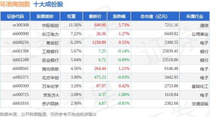 证券之星消息,1月30日,环渤海(399357)指数报收于3659.22点,涨0.54%,成交1106.46亿元,换手率0.43%。当日该指数成份股中,上涨的有12家,中际旭创以5.73%的涨幅领涨,下跌的有25家,中国中铁以3.23%的跌幅领跌。