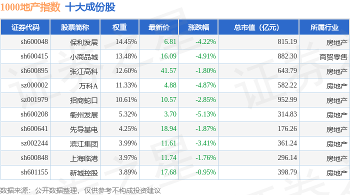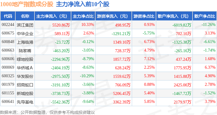 资金流向方面,1000地产(399367)指数成份股当日主力资金净流出合计12.96亿元,游资资金净流入合计6.29亿元,散户资金净流入合计6.67亿元。成份股资金流向详情见下表: