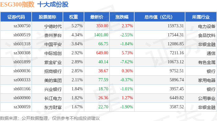 证券之星消息,1月30日,ESG300(399378)指数报收于2987.83点,跌1.13%,成交6185.65亿元,换手率1.19%。当日该指数成份股中,上涨的有65家,澜起科技以12.13%的涨幅领涨,下跌的有224家,南山铝业以10.05%的跌幅领跌。