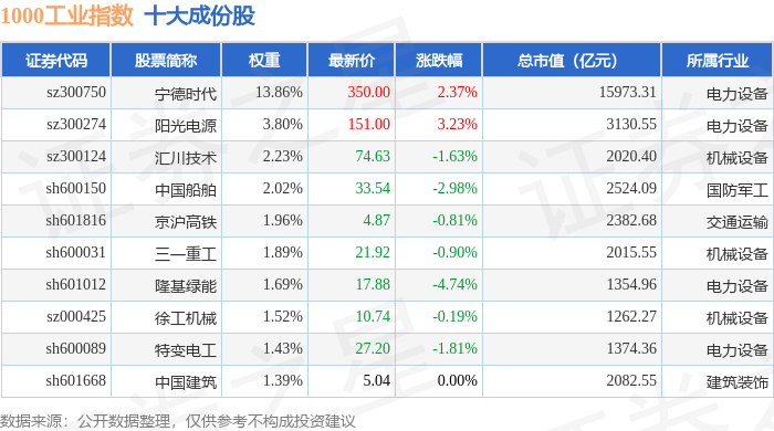 1000工业(399383)指数十大成份股详情如下: