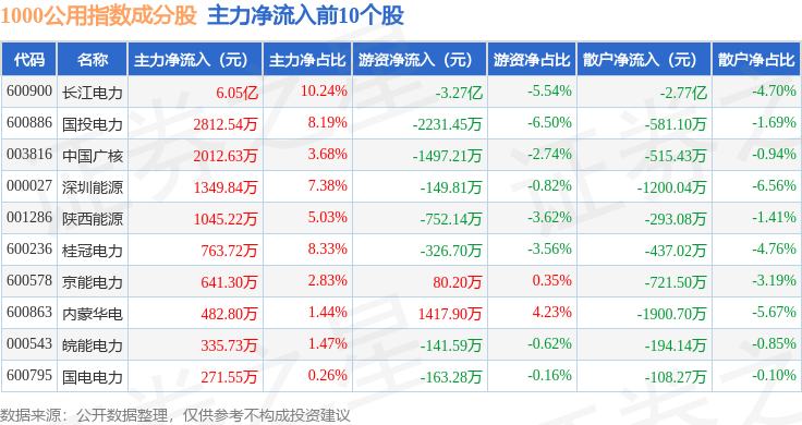 资金流向方面,1000公用(399390)指数成份股当日主力资金净流出合计4.73亿元,游资资金净流出合计1.26亿元,散户资金净流入合计5.99亿元。成份股资金流向详情见下表: