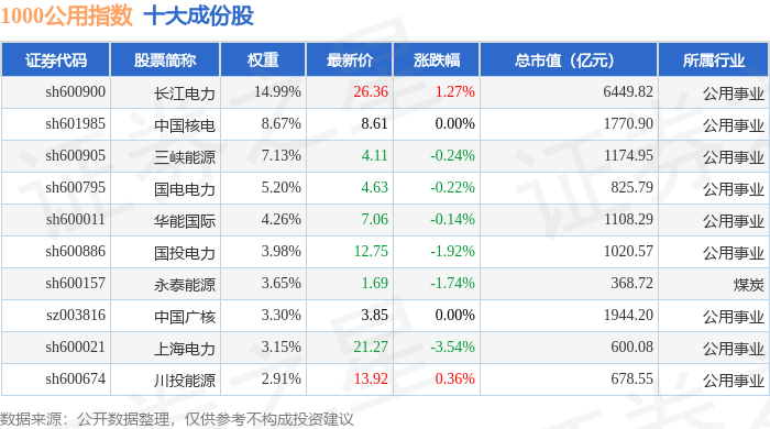证券之星消息,1月30日,1000公用(399390)指数报收于2630.86点,跌0.41%,成交247.73亿元,换手率1.1%。当日该指数成份股中,上涨的有13家,瀚蓝环境以3.32%的涨幅领涨,下跌的有28家,川能动力以7.17%的跌幅领跌。