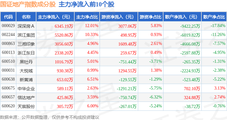 资金流向方面,国证地产(399393)指数成份股当日主力资金净流出合计19.12亿元,游资资金净流入合计7.54亿元,散户资金净流入合计11.58亿元。成份股资金流向详情见下表: