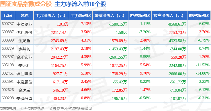 资金流向方面,国证食品(399396)指数成份股当日主力资金净流出合计23.09亿元,游资资金净流入合计8.09亿元,散户资金净流入合计15.0亿元。成份股资金流向详情见下表: