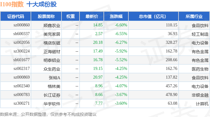 I100(399415)指数十大成份股详情如下: