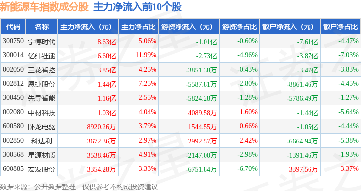 资金流向方面,新能源车(399417)指数成份股当日主力资金净流出合计47.15亿元,游资资金净流入合计13.63亿元,散户资金净流入合计33.34亿元。成份股资金流向详情见下表:
