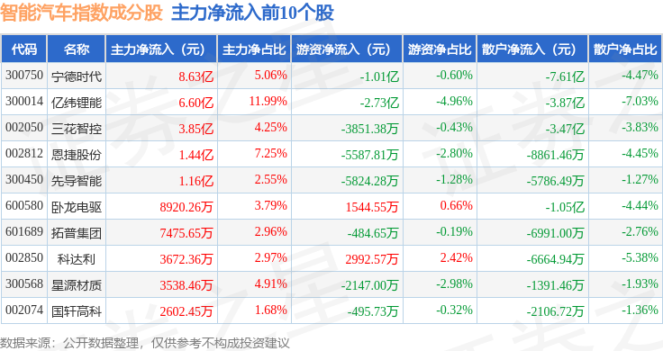资金流向方面,智能汽车(399432)指数成份股当日主力资金净流出合计25.37亿元,游资资金净流入合计5.3亿元,散户资金净流入合计20.07亿元。成份股资金流向详情见下表: