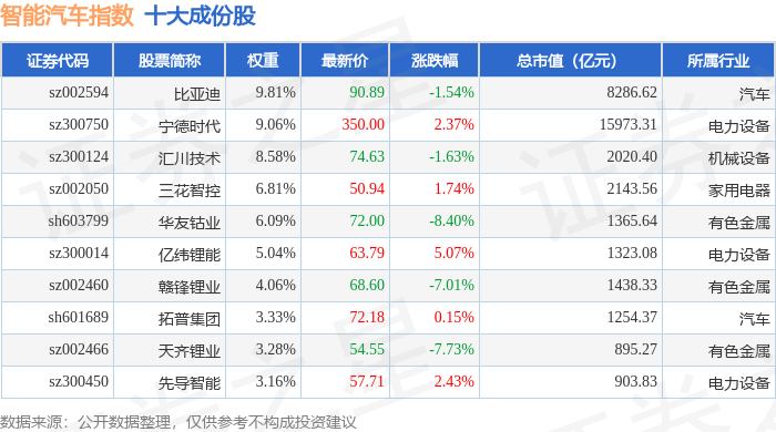 证券之星消息,1月30日,智能汽车(399432)指数报收于6696.97点,跌1.2%,成交916.23亿元,换手率3.03%。当日该指数成份股中,上涨的有13家,亿纬锂能以5.07%的涨幅领涨,下跌的有37家,华友钴业以8.4%的跌幅领跌。