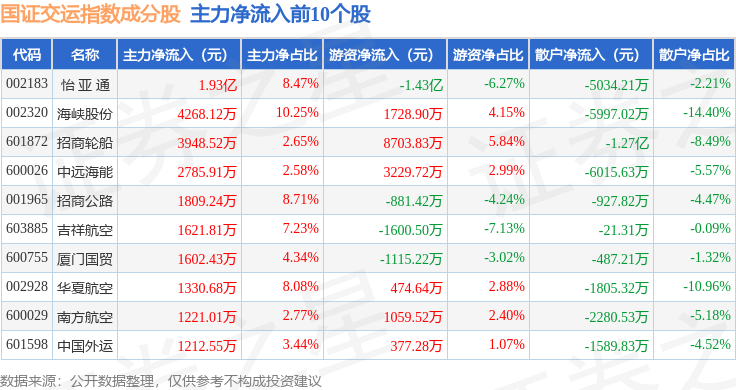 资金流向方面,国证交运(399433)指数成份股当日主力资金净流出合计8.34亿元,游资资金净流入合计4.55亿元,散户资金净流入合计3.79亿元。成份股资金流向详情见下表:
