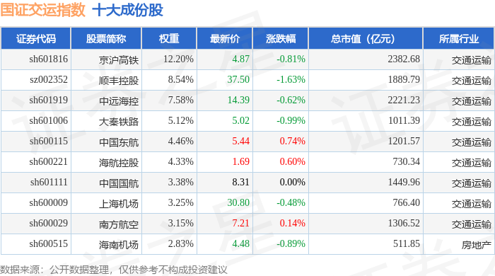 证券之星消息,1月30日,国证交运(399433)指数报收于1702.64点,跌0.41%,成交256.16亿元,换手率1.07%。当日该指数成份股中,上涨的有16家,怡亚通以3.95%的涨幅领涨,下跌的有36家,唐山港以2.06%的跌幅领跌。