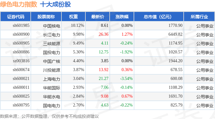 绿色电力(399438)指数十大成份股详情如下: