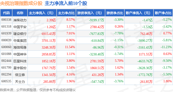 资金流向方面,央视治理(399554)指数成份股当日主力资金净流出合计35.49亿元,游资资金净流入合计12.91亿元,散户资金净流入合计22.58亿元。成份股资金流向详情见下表: