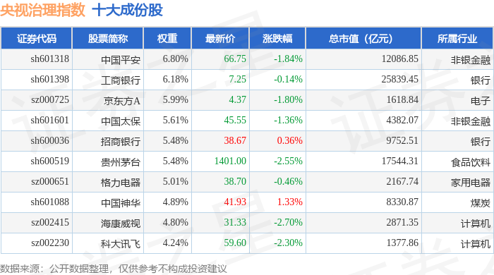 央视治理(399554)指数十大成份股详情如下: