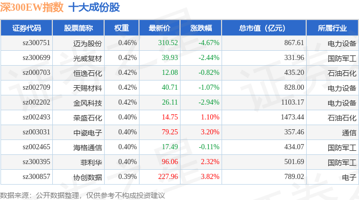 深300EW(399633)指数十大成份股详情如下: