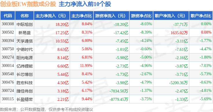 资金流向方面,创业板EW(399635)指数成份股当日主力资金净流出合计1963.84万元,游资资金净流出合计39.34亿元,散户资金净流入合计39.53亿元。成份股资金流向详情见下表: