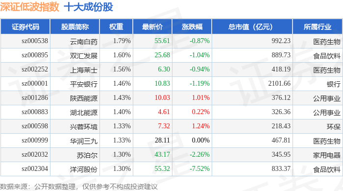 证券之星消息,1月30日,深证低波(399661)指数报收于6197.39点,跌1.59%,成交987.89亿元,换手率1.45%。当日该指数成份股中,上涨的有12家,中信特钢以3.27%的涨幅领涨,下跌的有84家,钒钛股份以8.59%的跌幅领跌。