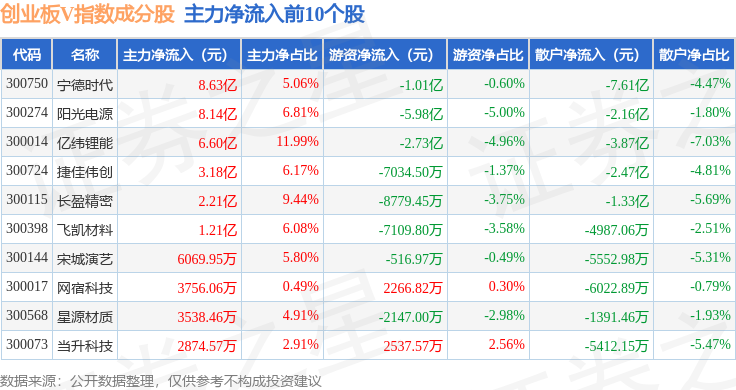 资金流向方面,创业板V(399668)指数成份股当日主力资金净流出合计11.05亿元,游资资金净流出合计6.02亿元,散户资金净流入合计17.07亿元。成份股资金流向详情见下表: