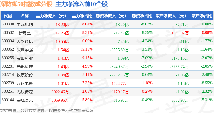 资金流向方面,深防御50(399671)指数成份股当日主力资金净流入合计1.66亿元,游资资金净流出合计28.01亿元,散户资金净流入合计26.36亿元。成份股资金流向详情见下表: