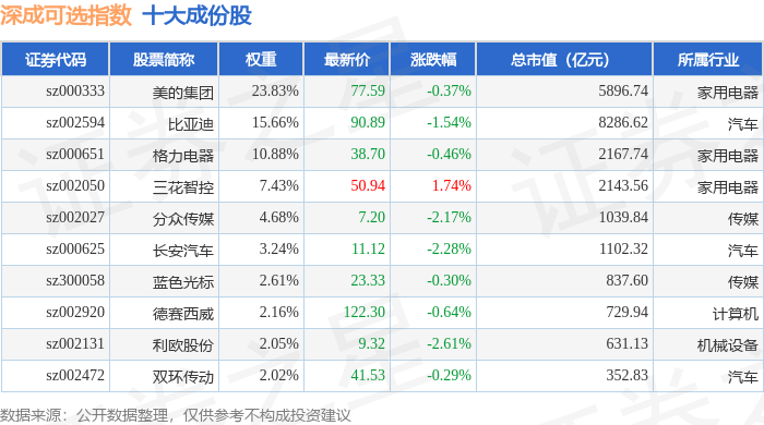 证券之星消息,1月30日,深成可选(399683)指数报收于1994.61点,跌0.62%,成交802.73亿元,换手率4.3%。当日该指数成份股中,上涨的有10家,光线传媒以7.12%的涨幅领涨,下跌的有34家,周大生以5.49%的跌幅领跌。