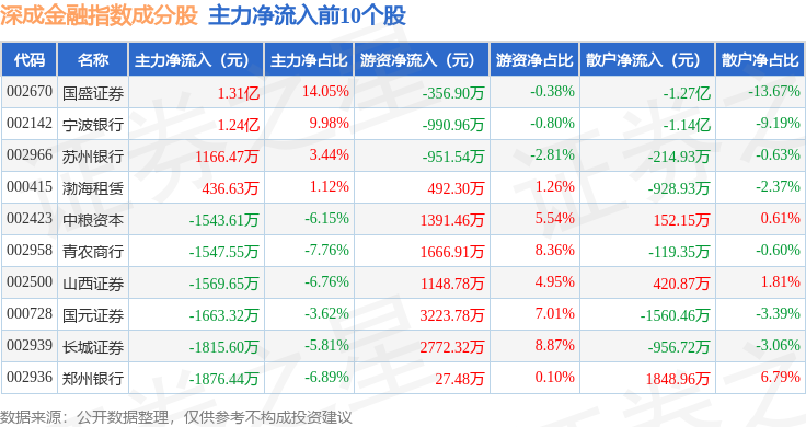 资金流向方面,深成金融(399686)指数成份股当日主力资金净流出合计16.07亿元,游资资金净流入合计8.1亿元,散户资金净流入合计7.97亿元。成份股资金流向详情见下表:
