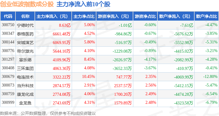 资金流向方面,创业低波(399692)指数成份股当日主力资金净流出合计27.37亿元,游资资金净流入合计6.84亿元,散户资金净流入合计20.53亿元。成份股资金流向详情见下表: