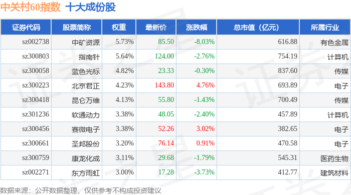 中关村60(399697)指数十大成份股详情如下: