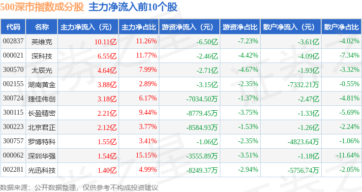 资金流向方面,500深市(399802)指数成份股当日主力资金净流出合计120.93亿元,游资资金净流入合计17.78亿元,散户资金净流入合计103.15亿元。成份股资金流向详情见下表: