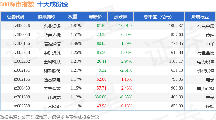 500深市(399802)指数十大成份股详情如下:
